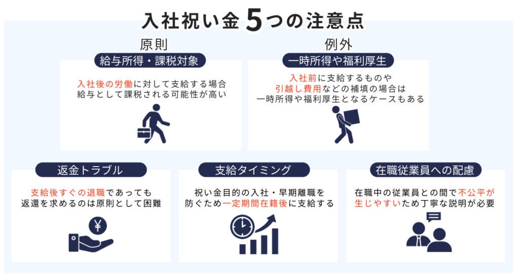 入社祝い金の支給には、法的トラブルにつながらないよう注意すべきポイントがあります。