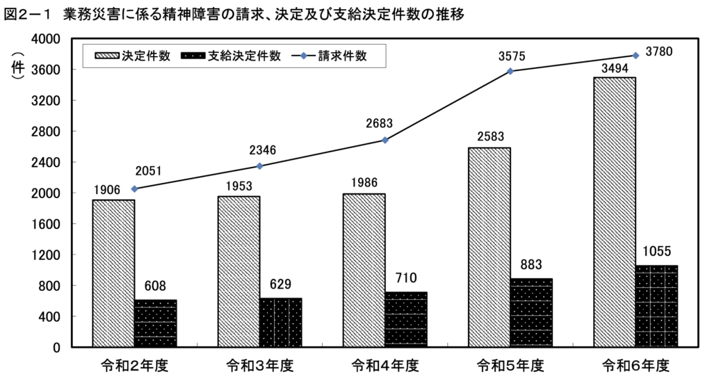 一方で、精神障害による労災認定件数は、令和6年度で1,055件と過去最多を記録しており、長期休業や退職に至る従業員も増加傾向にあります。