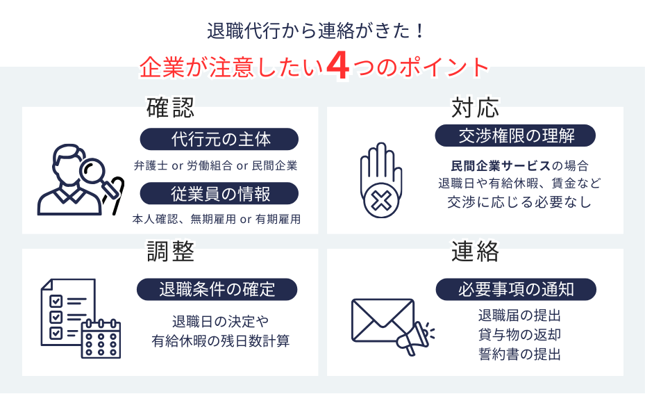 退職代行から連絡があった場合、まずは冷静に事実関係を整理し、適切な手順で対応することが重要です。