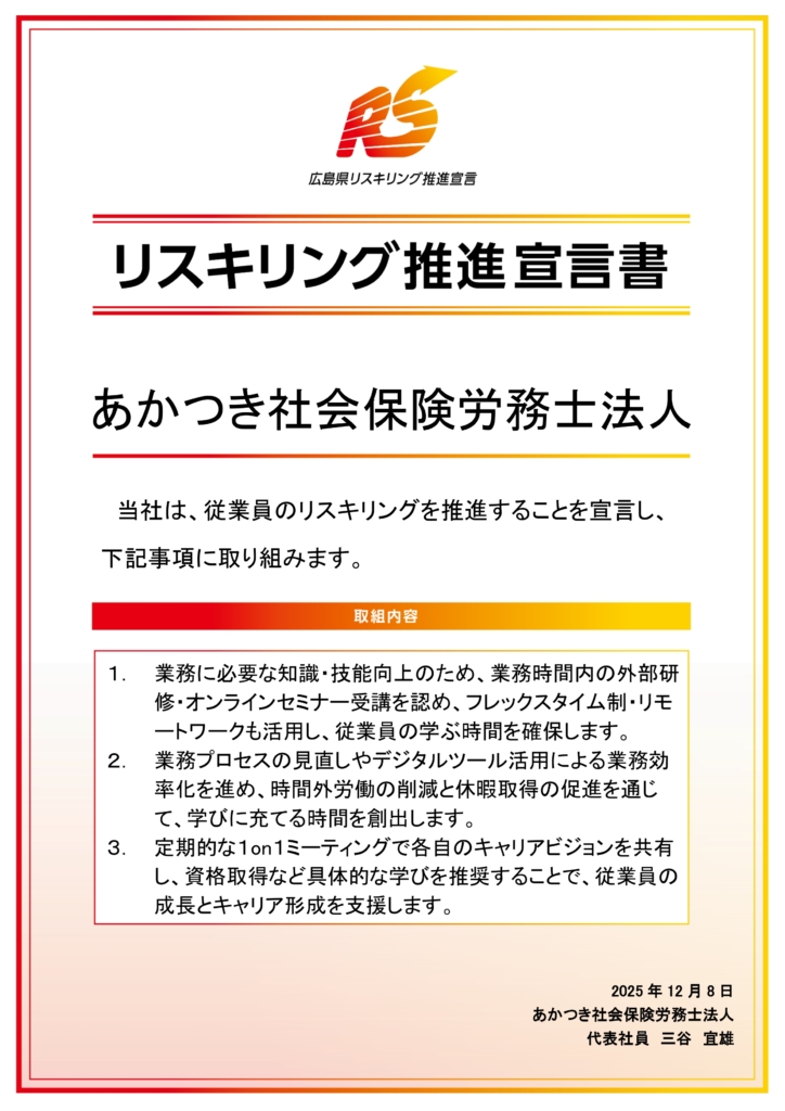 あかつき社会保険労務士法人は、従業員が新たな業務等に必要となるスキルや知識を習得するための支援策として「広島県リスキリング推進宣言」を策定いたしました。