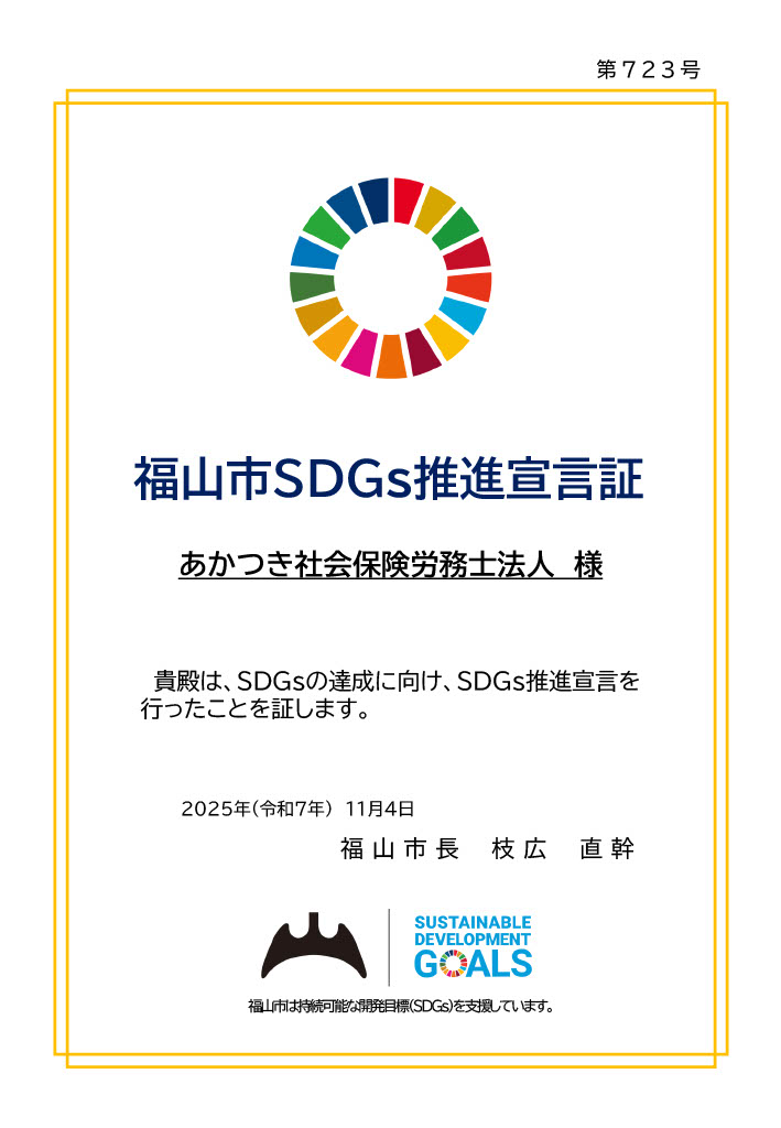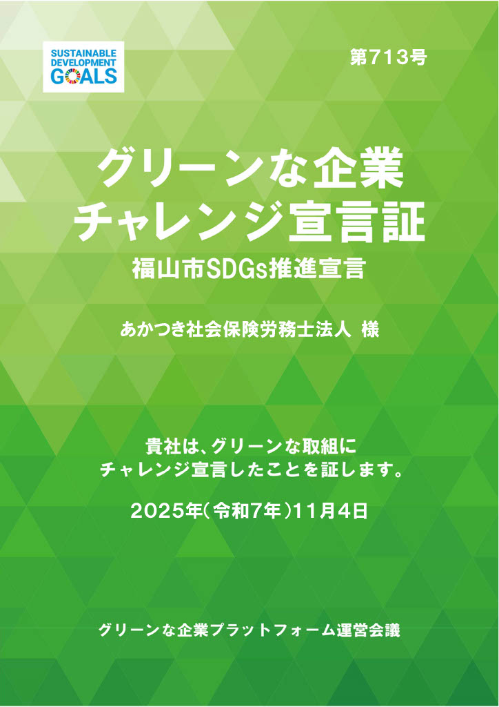 このたび、あかつき社会保険労務士法人は、福山市が推進する「福山市SDGs推進宣言」および「グリーンな企業チャレンジ宣言」に登録されました。